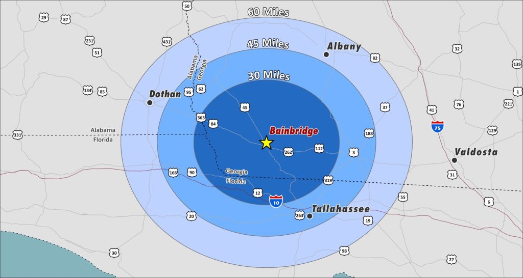 - Interstate I-10 is 38 miles south of Bainbridge.